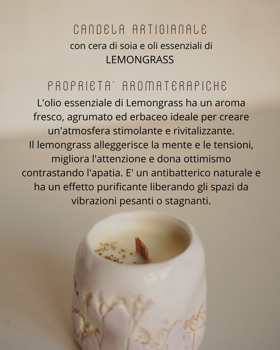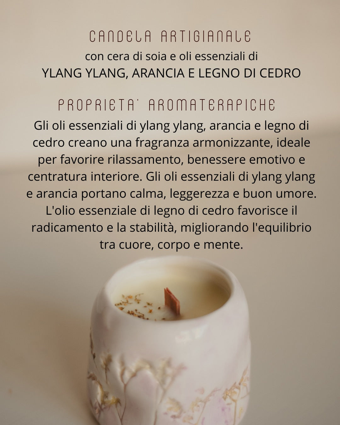 La fragranza naturale si diffonde lentamente nello spazio avvolgendo l’ambiente in un’atmosfera intima, calma e profonda.